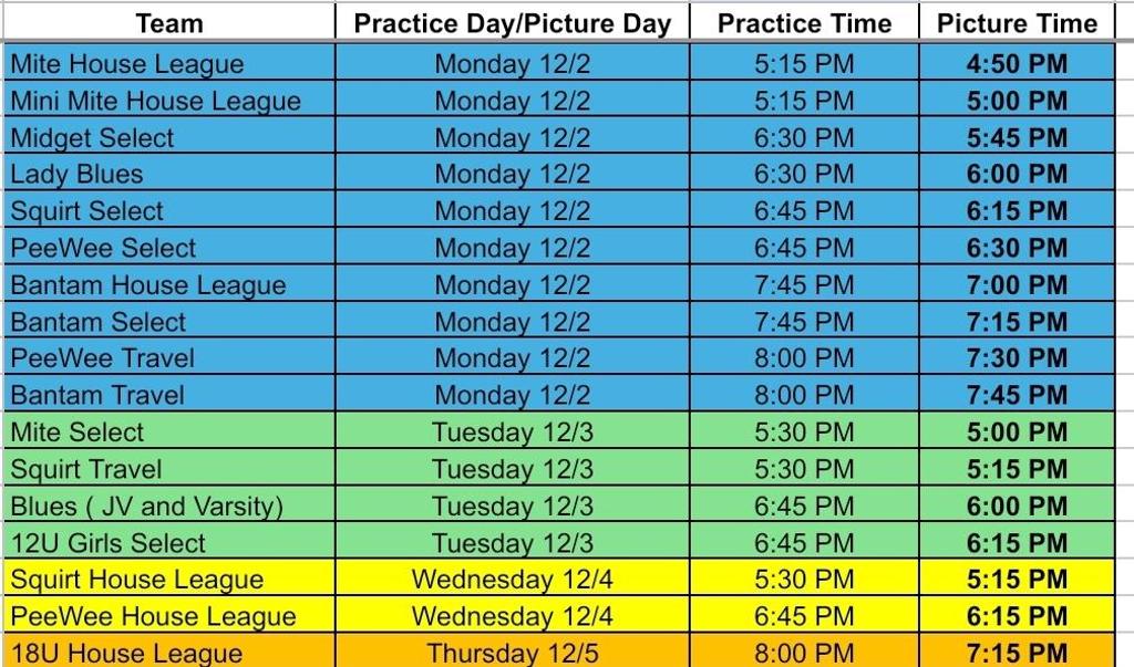 - All Select and Travel team photos will be a group photo. All players and coaches must be present for the picture. ( Teams include: Mite Select, Squirt Select, Squirt Travel, 12U Girls Select, PeeWee Select, PeeWee Travel, Bantam Select, Bantam Travel, Lady Blues and Blues)